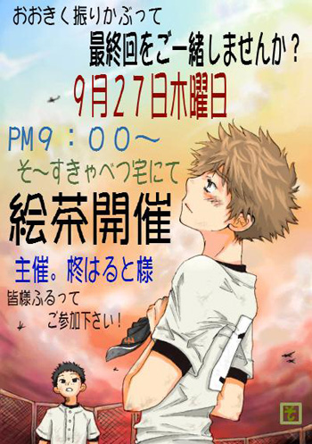 そ~す様Ver.の絵茶告知イラストです~!!頂いてきました!!!わわわ私との差が激しすぎる・・・orz可愛いよ三橋。なんでこう上手く描けるのか・・・!!!また絵茶で生絵を拝見させていただくとしますか!初めての絵茶でお隣だったことがなつかしいですww栄口かわいかったなぁwあ、縮小させていただきました。