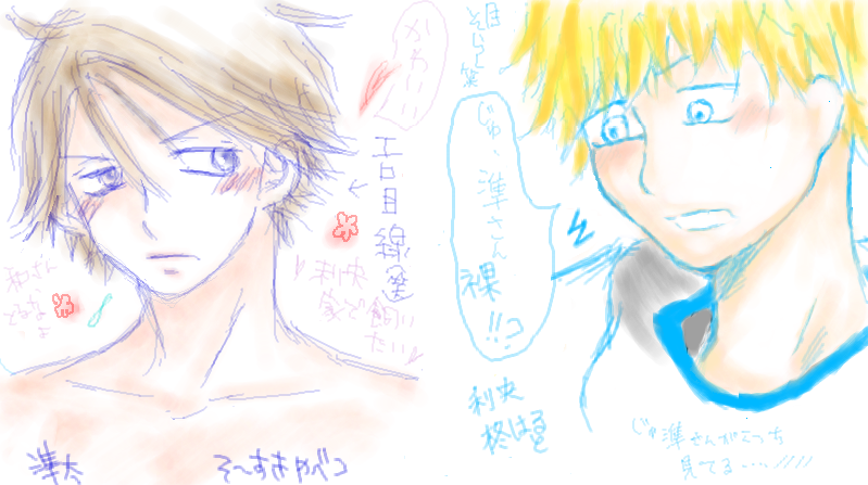 おお振りアニメの実況メールしてたらなにやら絵茶的な展開になったのでしちゃったぜ!入ったとたん、エロい準くんお出迎えなんだもん!!いやーしかしアニメの準くんウインクにやられてました。倒れた。田島様は相変わらずかっこいい!今日ABEのターンあまりなかったような気がすんんなぁ。そ~すさんと初めての二人絵茶!!そ~すさんが相変わらず上手すぎなので見とれてました。というか準くんの目線が気になって集中できんかったです。あー利央もっと上手に描きたいYO!